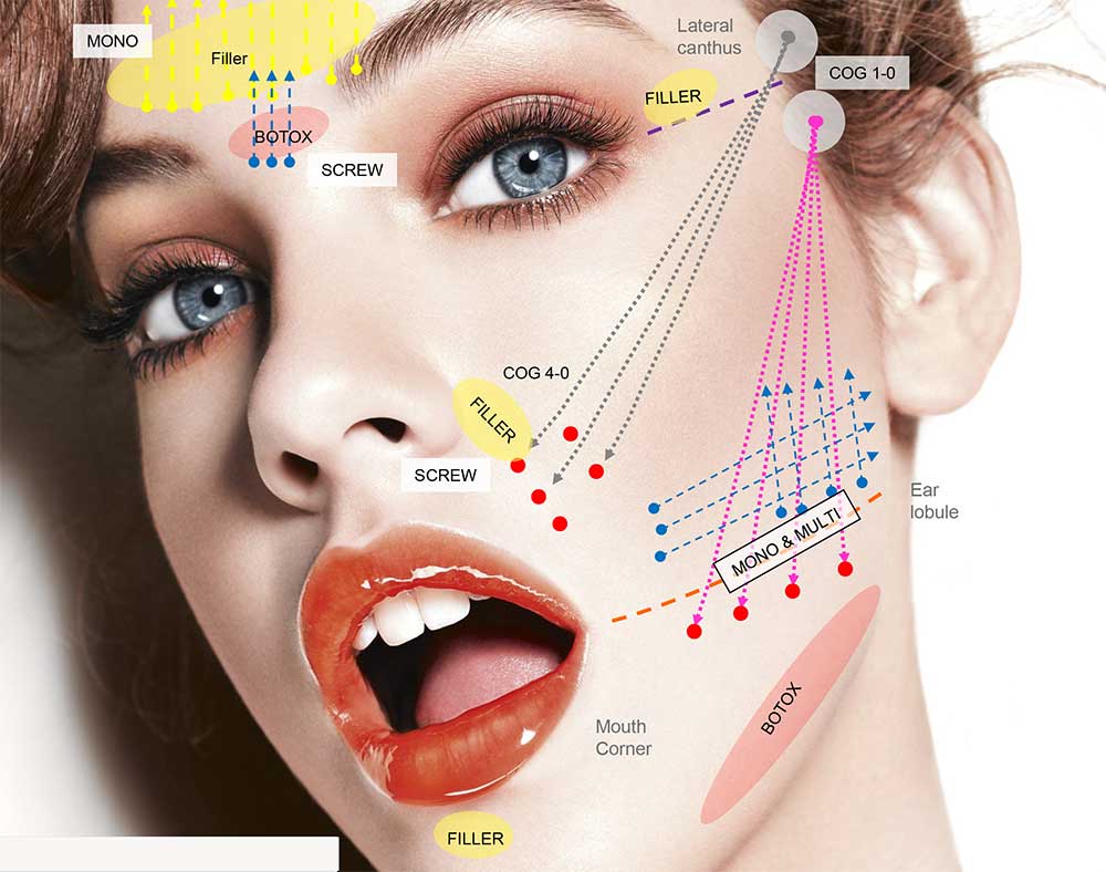 - Woffles Lift verzija 1-vstopne točke za nitke so vzdolž prednje črte lasišča na zalizcih, kjer je tudi zanka (vrh)nitke. Oba kraka te ,,navpične V zanke ” potem z iglo usmerjamo proti lasišču senc, iglo odstranimo, nitke zategnemo in zvežemo. Nitke se zaradi številnih zobcev čvrsto zagozdijo v tkivo, kar zadostuje za stabilno pritrditev dvignjenih tkiv. Na ta način pasivno dvigamo rep obrvi, lateralni kantus, osrednji del obraza , mehka tkiva spodnje čeljusti, kar je odvisno od vektorjev vleka in števila nitk.